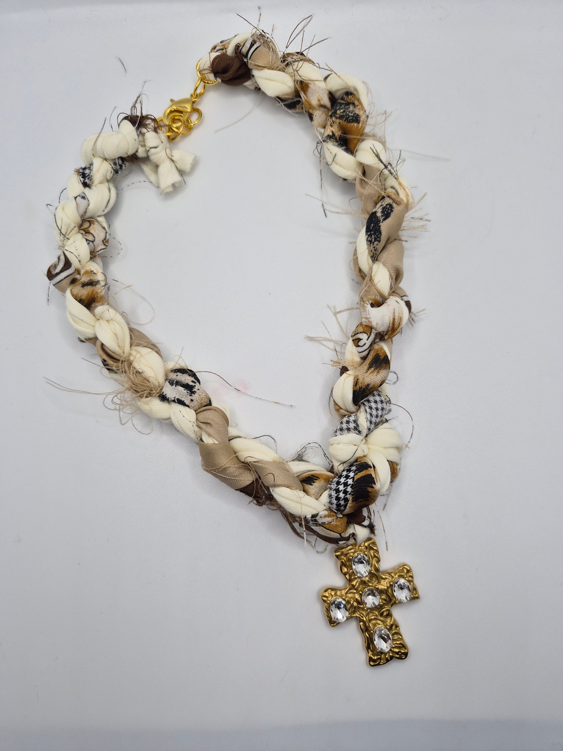 Elevate your accessory game with the Distressed Sophie Necklace. Made from a chic upcycled satin scarf and jersey material, this lightweight necklace adds a touch of edgy style to any outfit. Complete with a Christian Lacroix inspired pendant, it brings a retro look with a modern twist.
