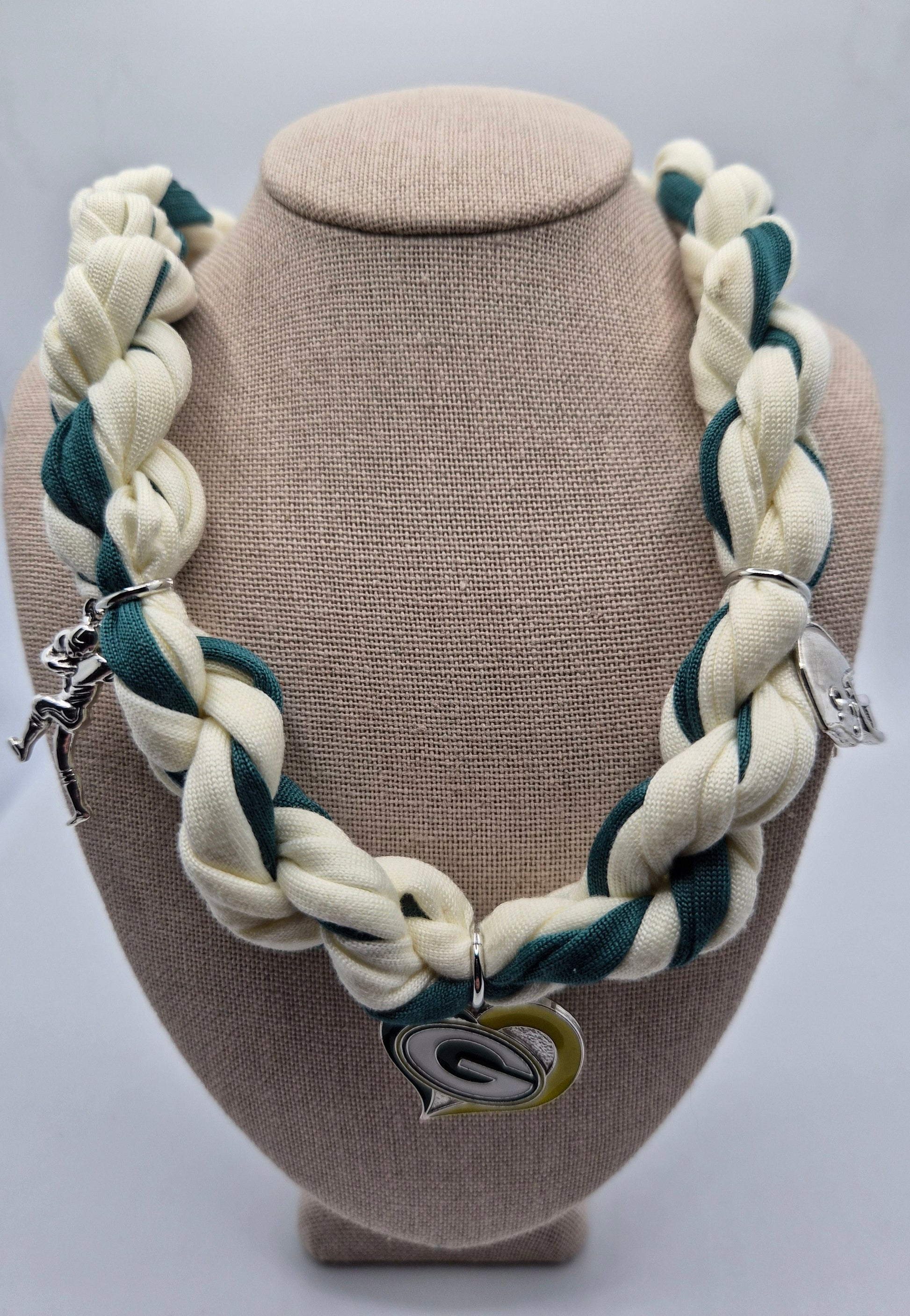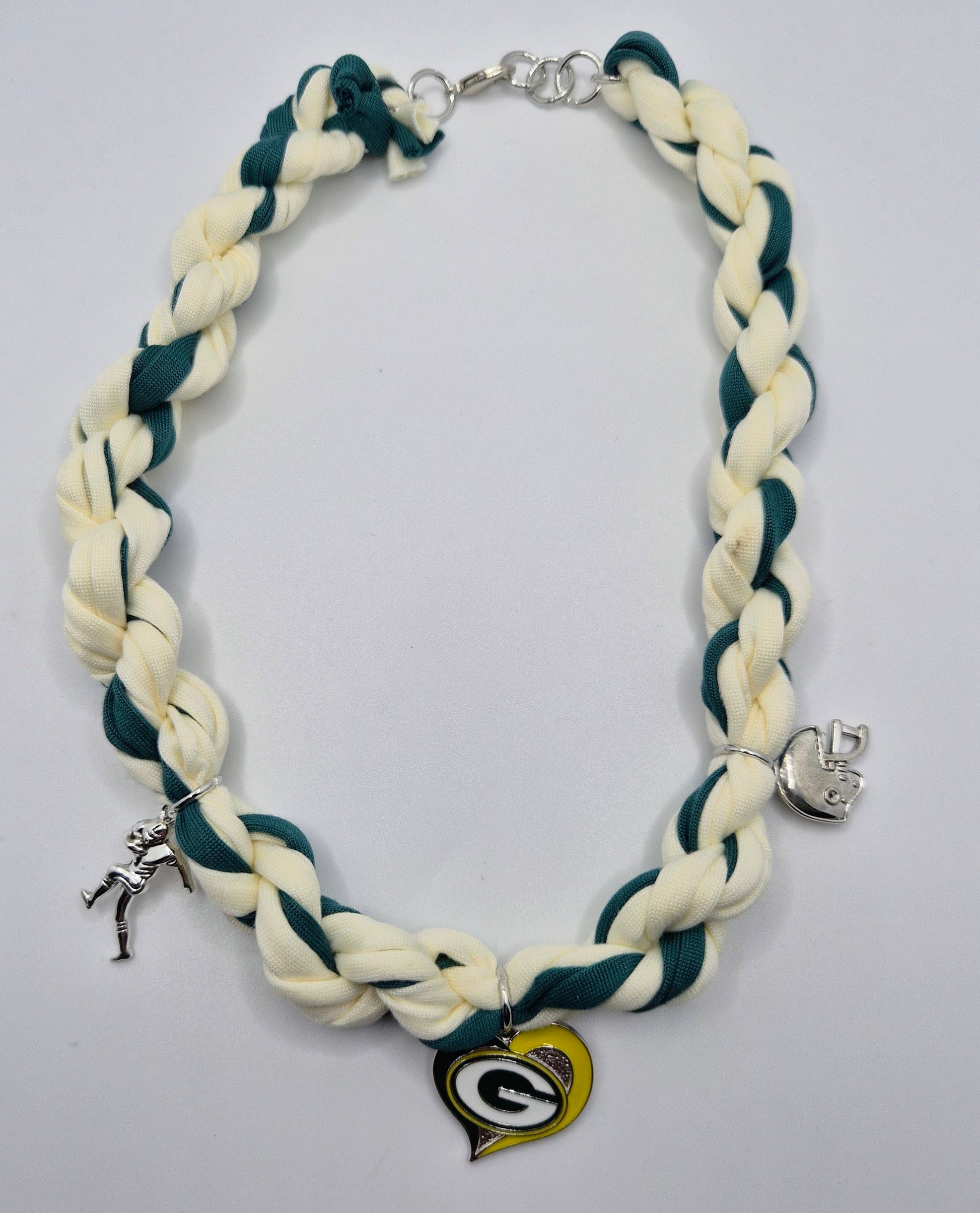 Elevate your game day style with the Packers Football Necklace. Crafted with a braided fabric charm, this necklace adds a touch of team spirit to any outfit. Show off your love for the Packers while elevating your look. Perfect for any football enthusiast or loyal fan.